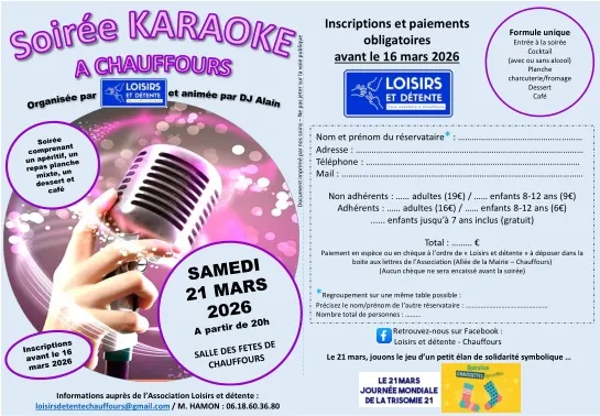 Samedi 21 mars à partir de 20h00 à la salle des fêtes de Chauffours : Soirée karaoké de Loisirs et Détente.
