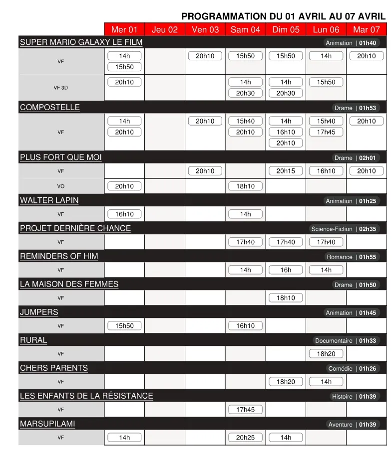 Cinéma Le Dunois - Programme des séances du 1er au 7 avril 2026