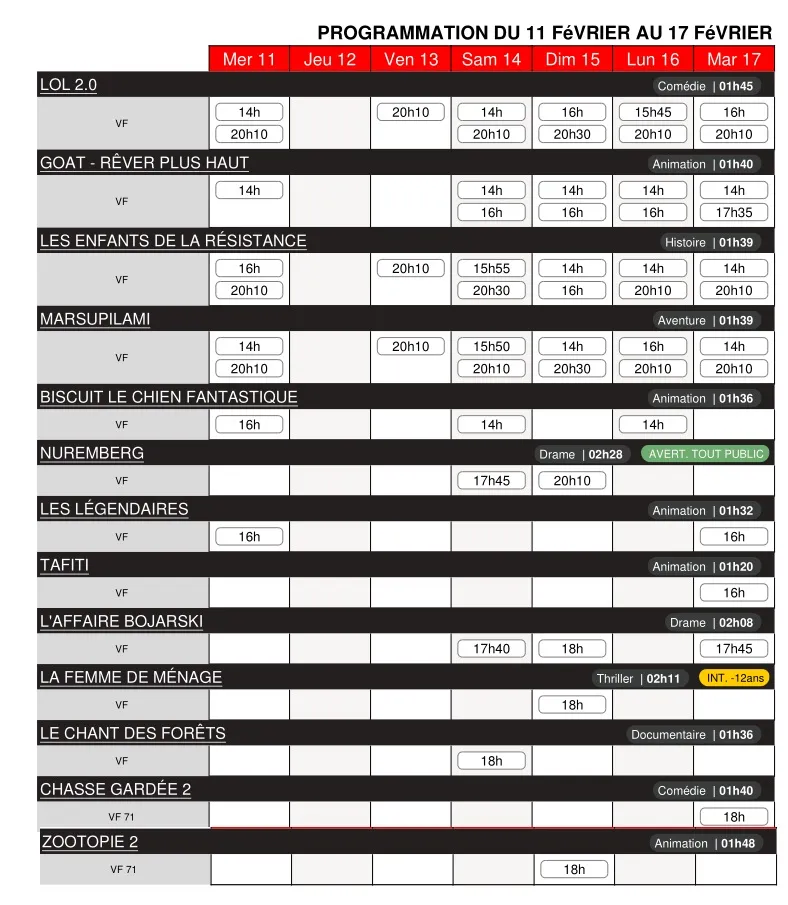 Cinéma Le Dunois - Programme des séances du 11 au 17 février 2026