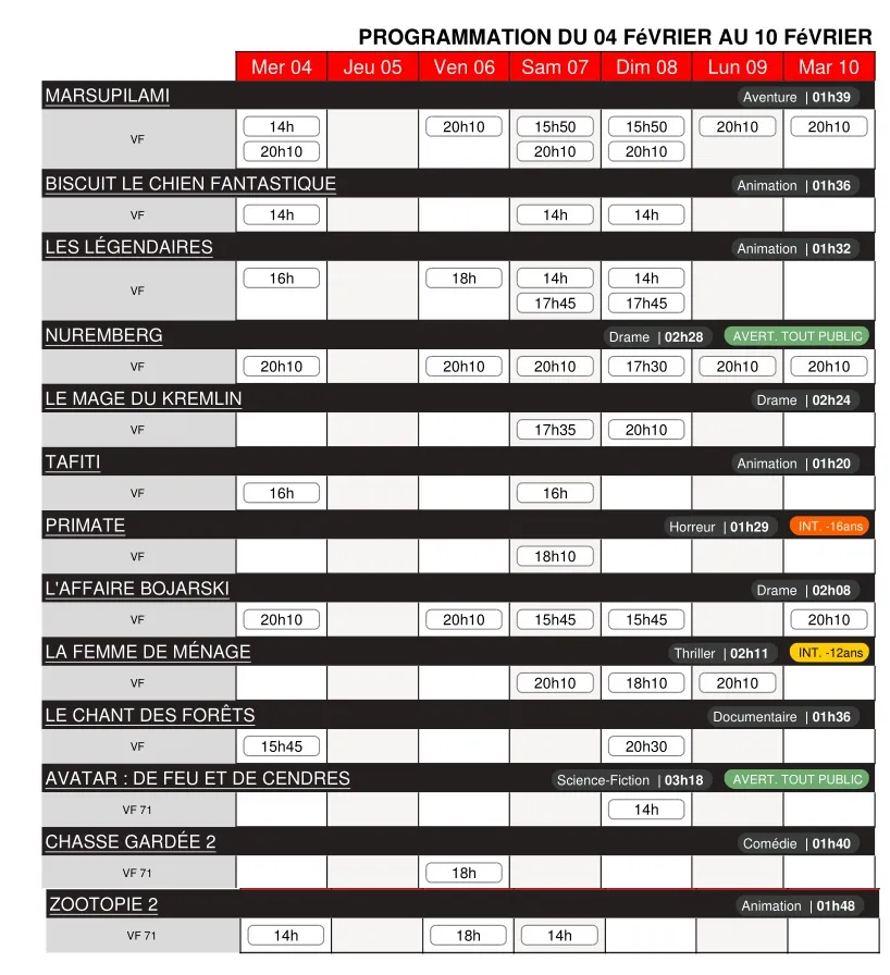 Cinéma Le Dunois - Programme des séances du 4 au 10 février 2026