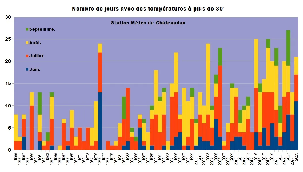 Depuis 70 ans, de 1955 à aujourd'hui, la station météorologique de Châteaudun a enregistré 735 jours où les températures ont dépassé les 30° pendant les mois d'été de juin à septembre.