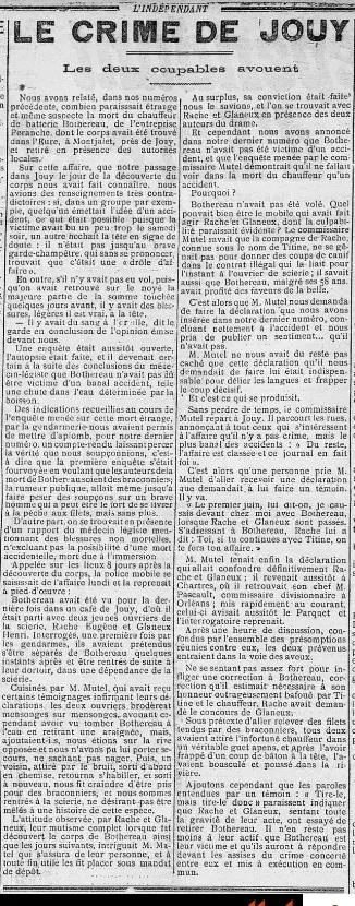 « Le crime de Jouy » est aussi le titre d'un très long article de l'Indépendant d'Eure-et-Loir du 13 juillet 1925 et sous titré « Les deux coupables avouent ».