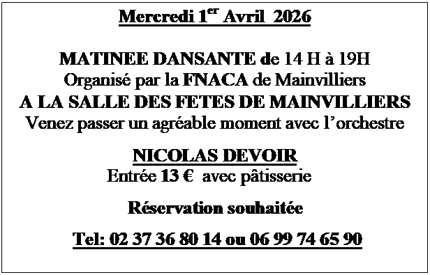Mercredi 1er avril de 14h00 à 19h00 à la salle des fêtes de Mainvilliers : Thé dansant avec Nicolas Devoir. Organisé par la FNACA de Mainvilliers.