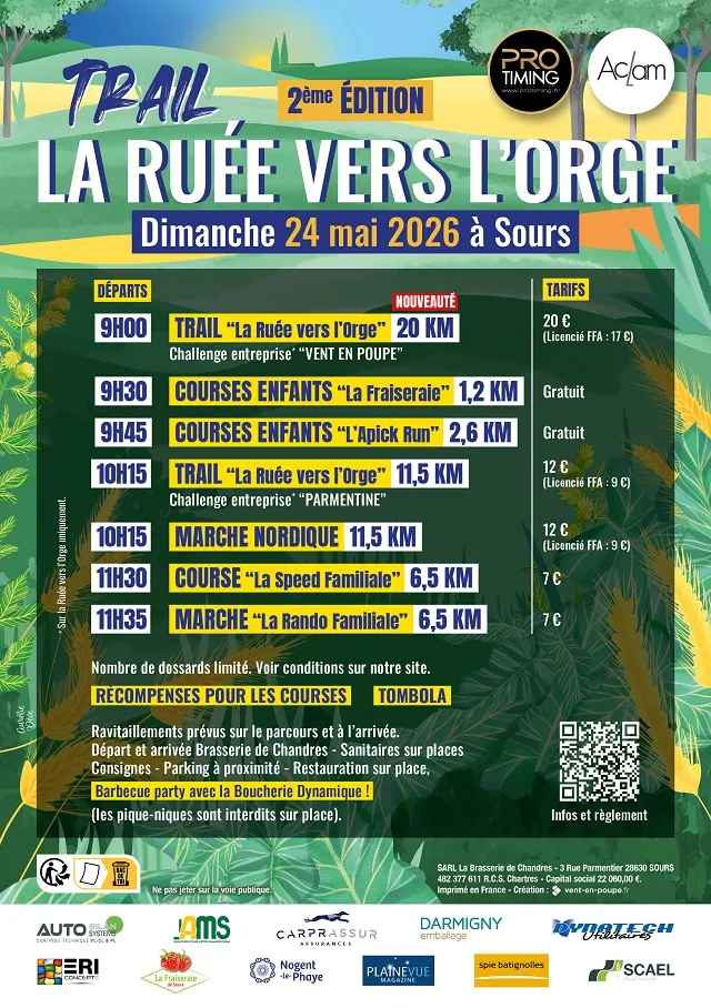 9h15 : “La Ruée vers l’orge” , trail et marche nordique – 11 km. Cadets et plus, 12 € (14 € sur place le jour de l’évènement). 2 € de réduction pour les licenciés FFA. Récompense à l’arrivée selon classement des catégories. Un challenge entreprises et son classement, est prévu pour cette course.